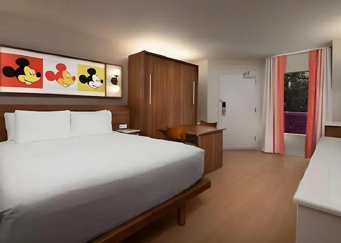 Featuring a restaurant, the perfect 3-star Disney'S Pop Century Resort Lake Buena Vista is located merely a 5-minute stroll from The Tramp. Guests can take a walk along the river, 16 km away, while staying at the budget resort, which also boasts an outdoor swimming pool on site.